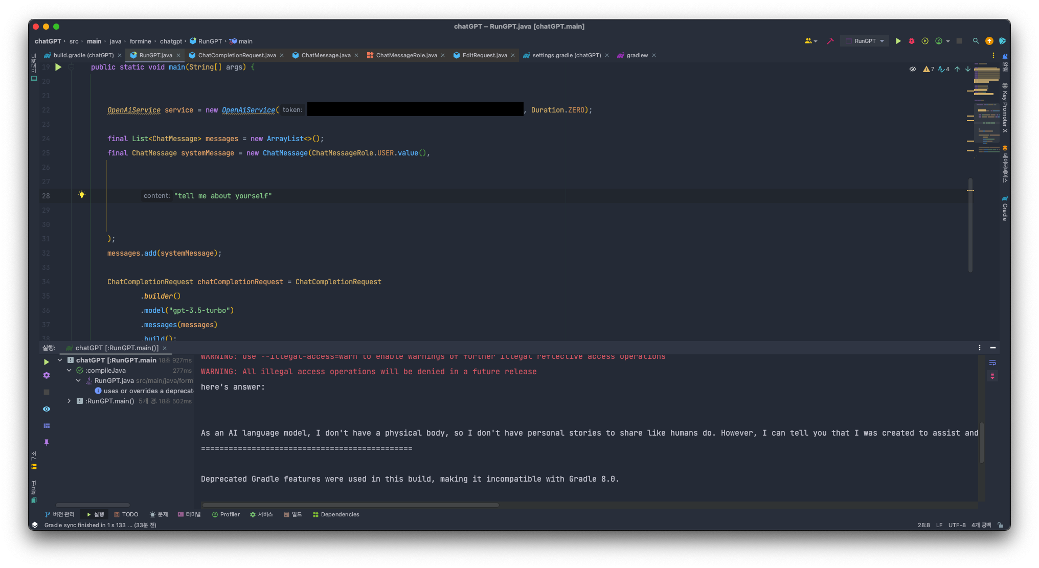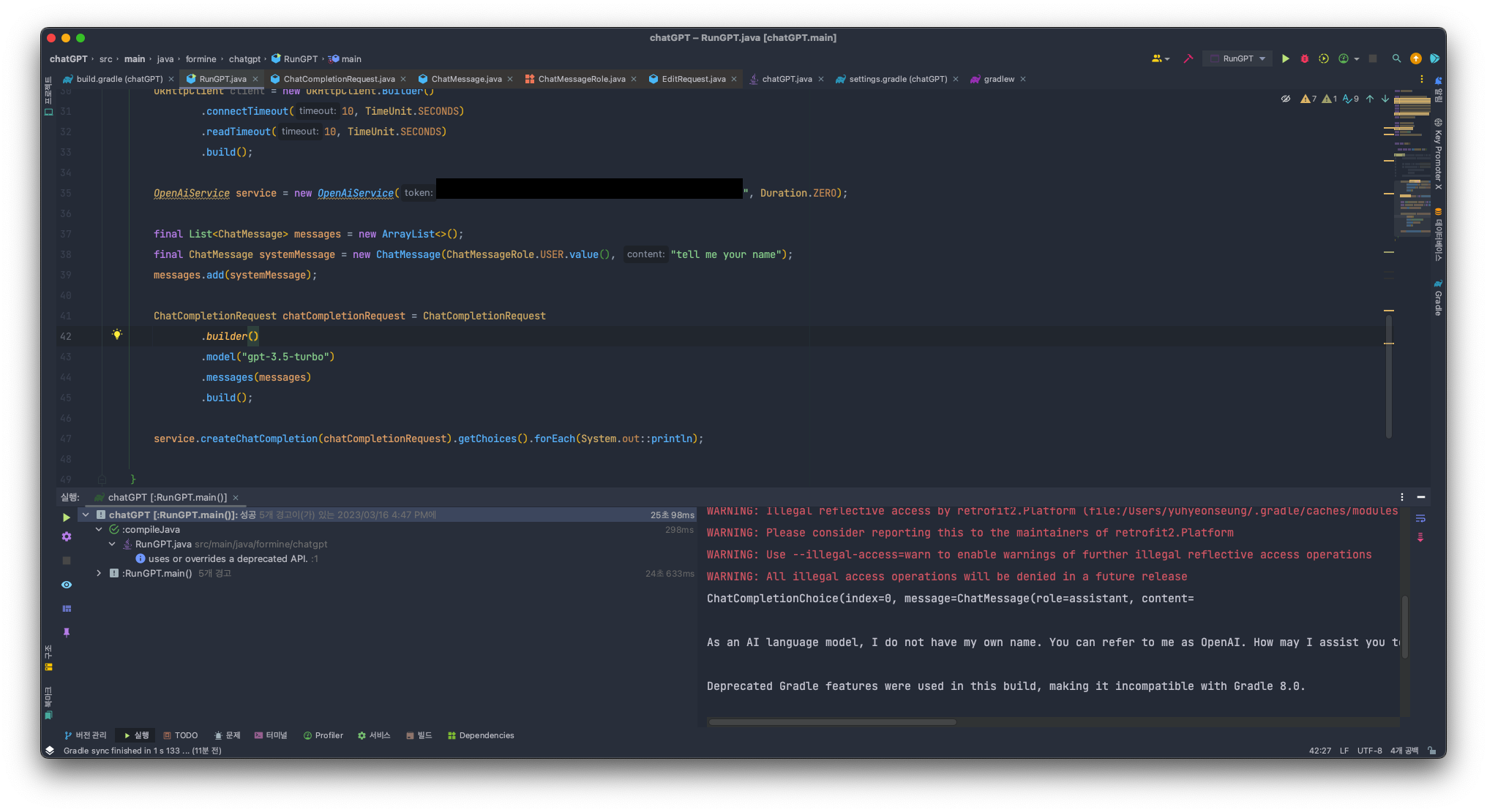 지금은 질문을 하나만 보내는 것을 생각해 둬서 0번째 답변만을 가져오고, 해당 메시지 content만을 출력하고 있는 상태입니다.