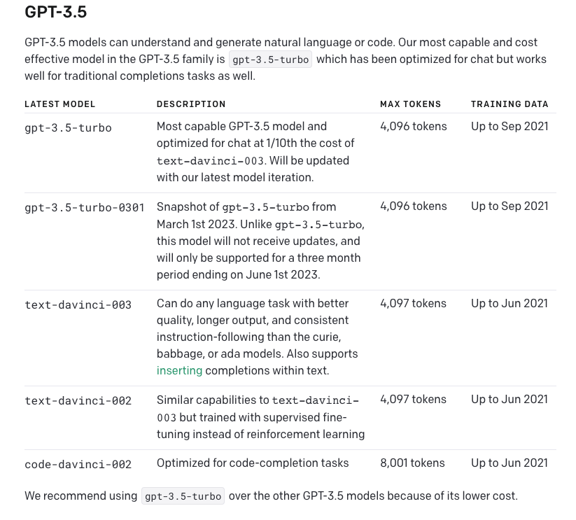 gpt 모델을 설정합니다. 각 모델에 따라서 성능이나 과금에 영향이 있을 수 있으니, 아래 링크를 참고해서 선택하시면 됩니다.