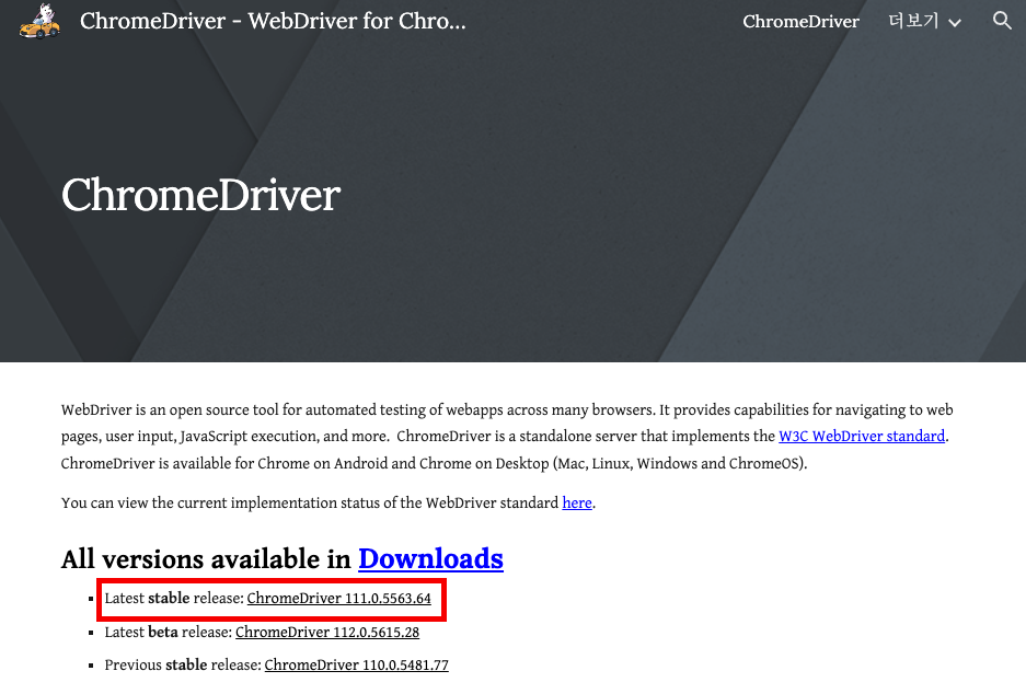 아래 링크에서 크롬 버전에 맞는 드라이버를 다운받습니다.