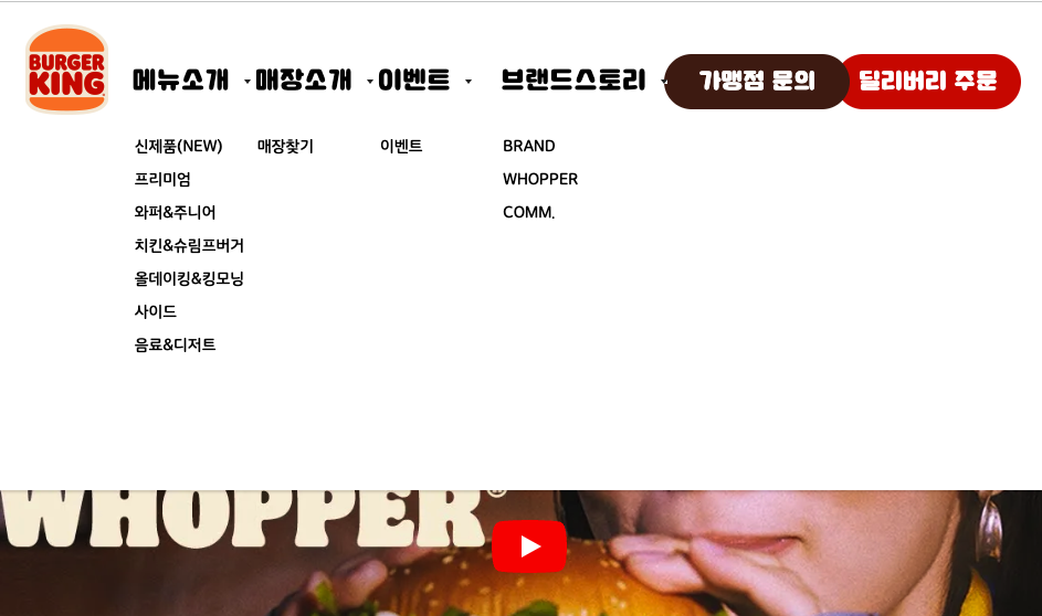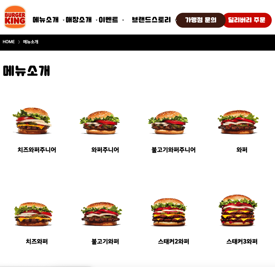 먼저 버거킹 홈페이지에 접속했을때 메뉴가 보여지도록 해 줘야되는 동작들이 있습니다.