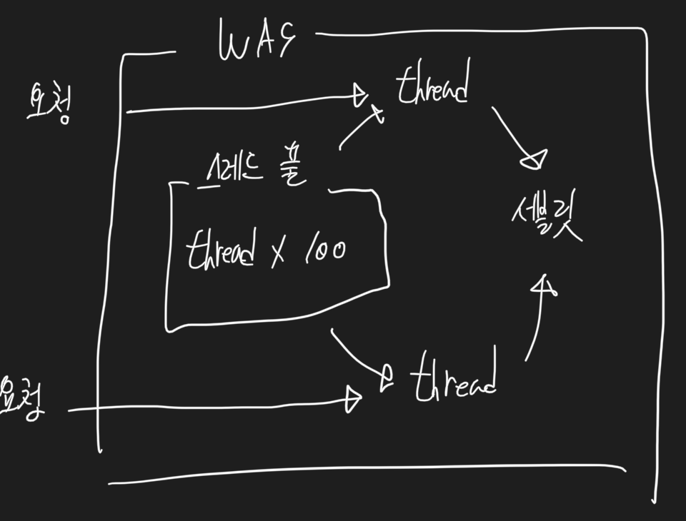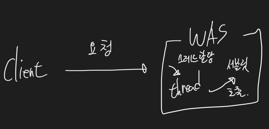 클라이언트에서 WAS로 요청이 들어오면 스레드를 할당하고 서블릿을 호출해, response에 담긴 내용으로 WAS가 http응답 정보를 생성해 보내줄 것이다.
