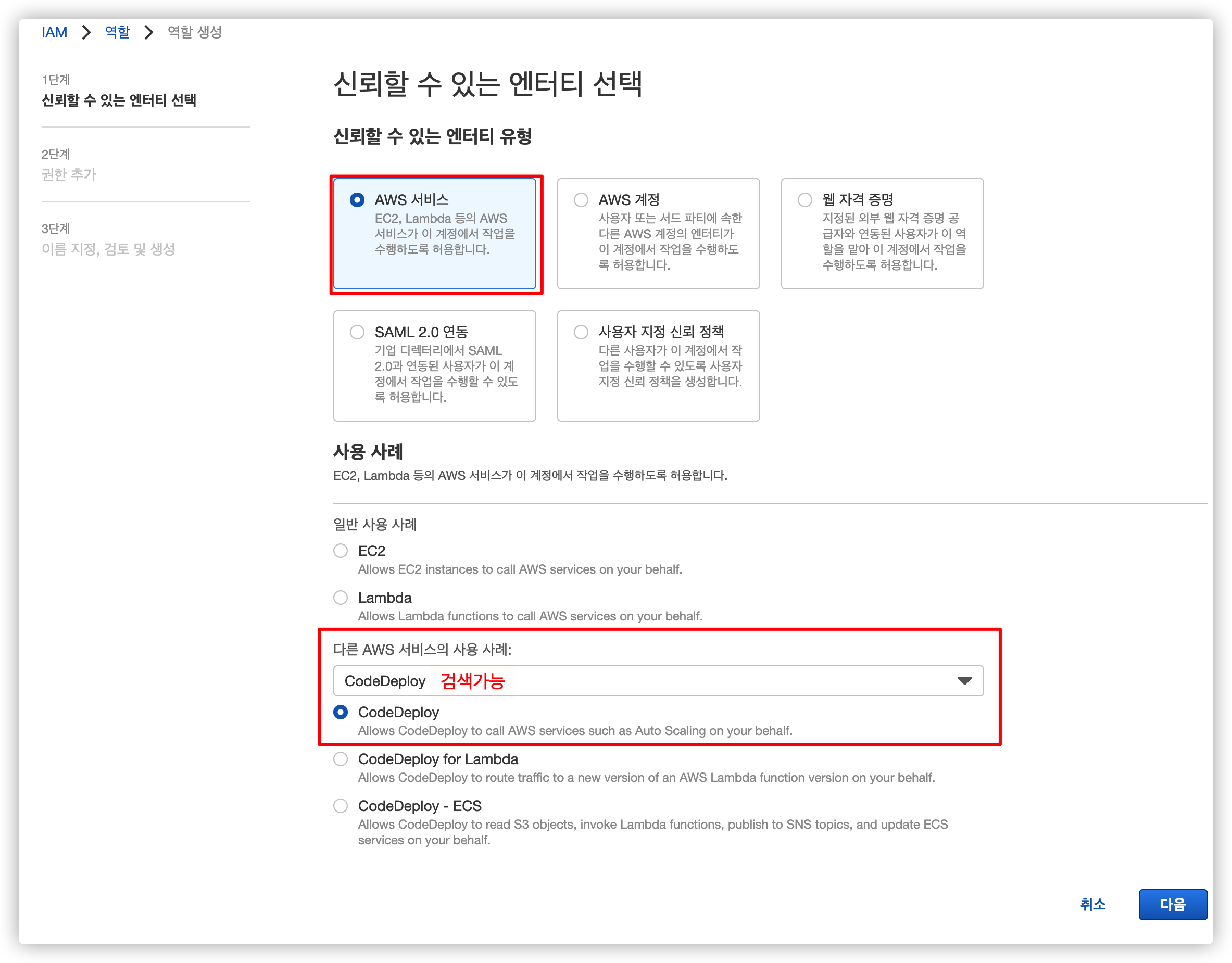 codeDeploy 전용 iam 역할 만들기