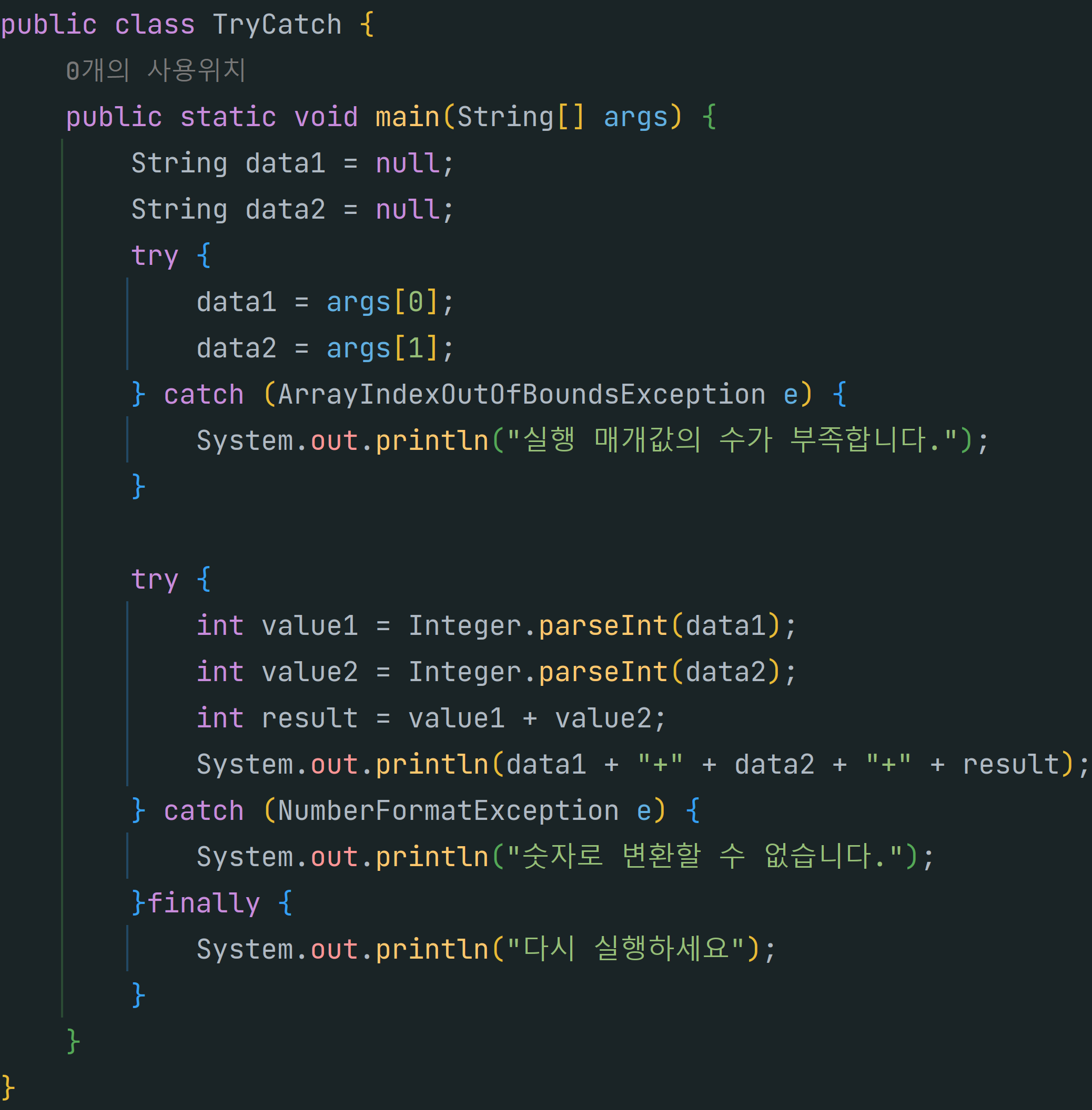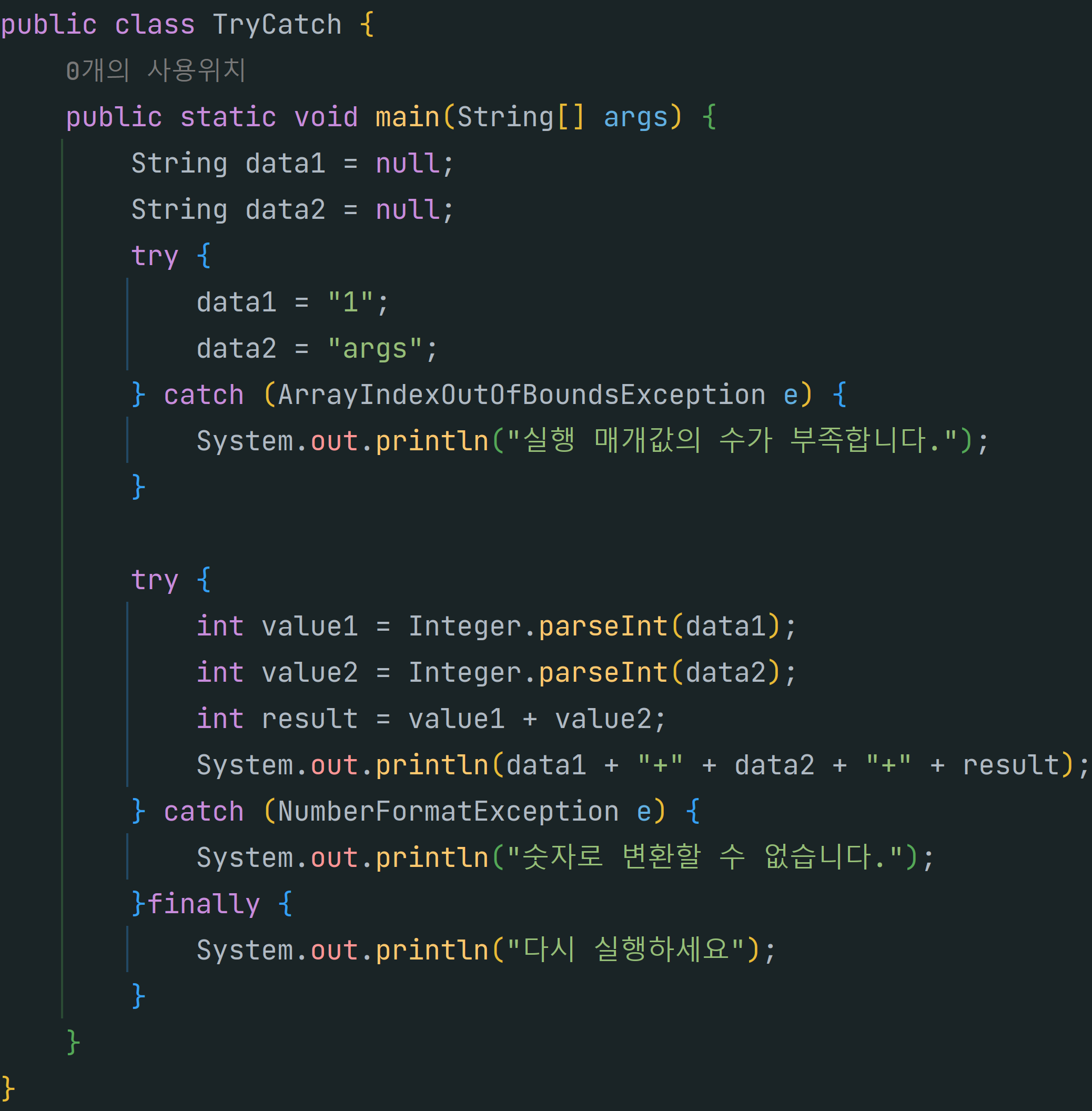 - try블록의 코드가 예외 발생 없이 실행되면 catch 블록의 코드는 실행되지 않는다.