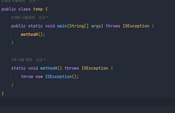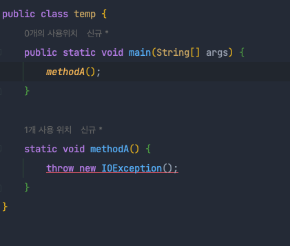 위 코드에서 IOException은 Checked Execption이기 때문에 컴파일 단계에서 예외 확인이 된다.