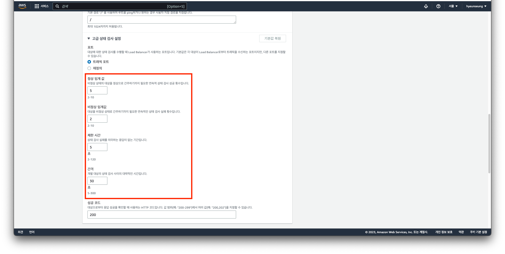 지금 설정값을 보면 인터벌이 30초이니, 30초마다 5번 health check를 통과해야 합니다.