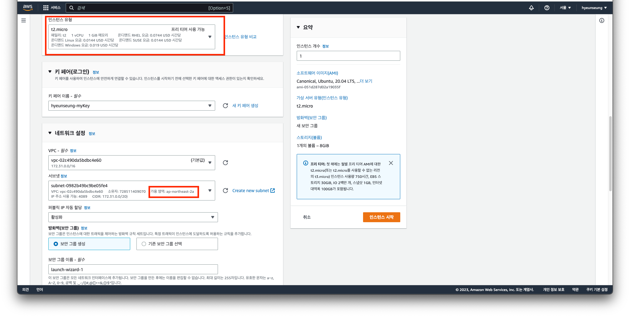 ap-northeast-2a / ap-northeast-2c로 각각 설정하였습니다. (아마 프리티어에서는 2a , 2c가 가능했었던 것 같습니다.)
