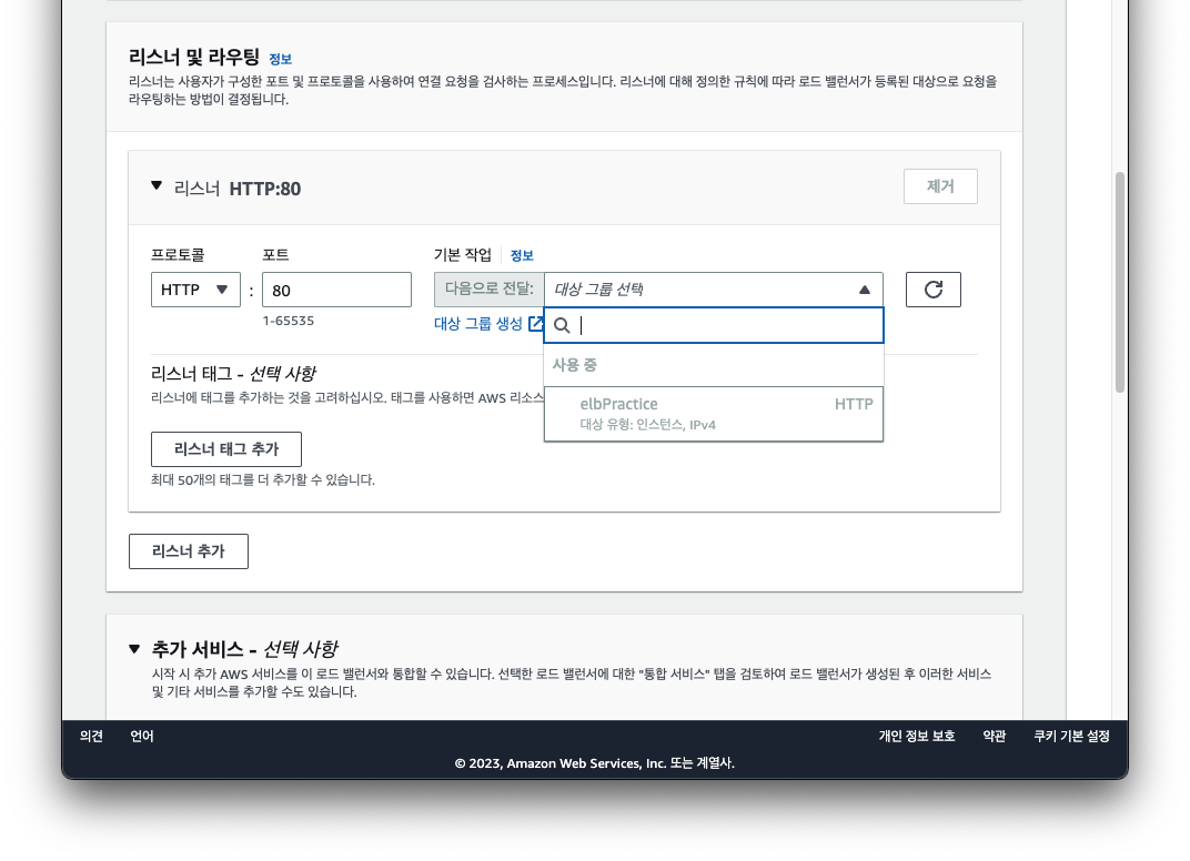 하기 이미지에는 없지만, 대상 그룹에서 선택한 인스턴스들을 대상에 등록하는 과정이 있습니다. 등록해 주시면 됩니다.