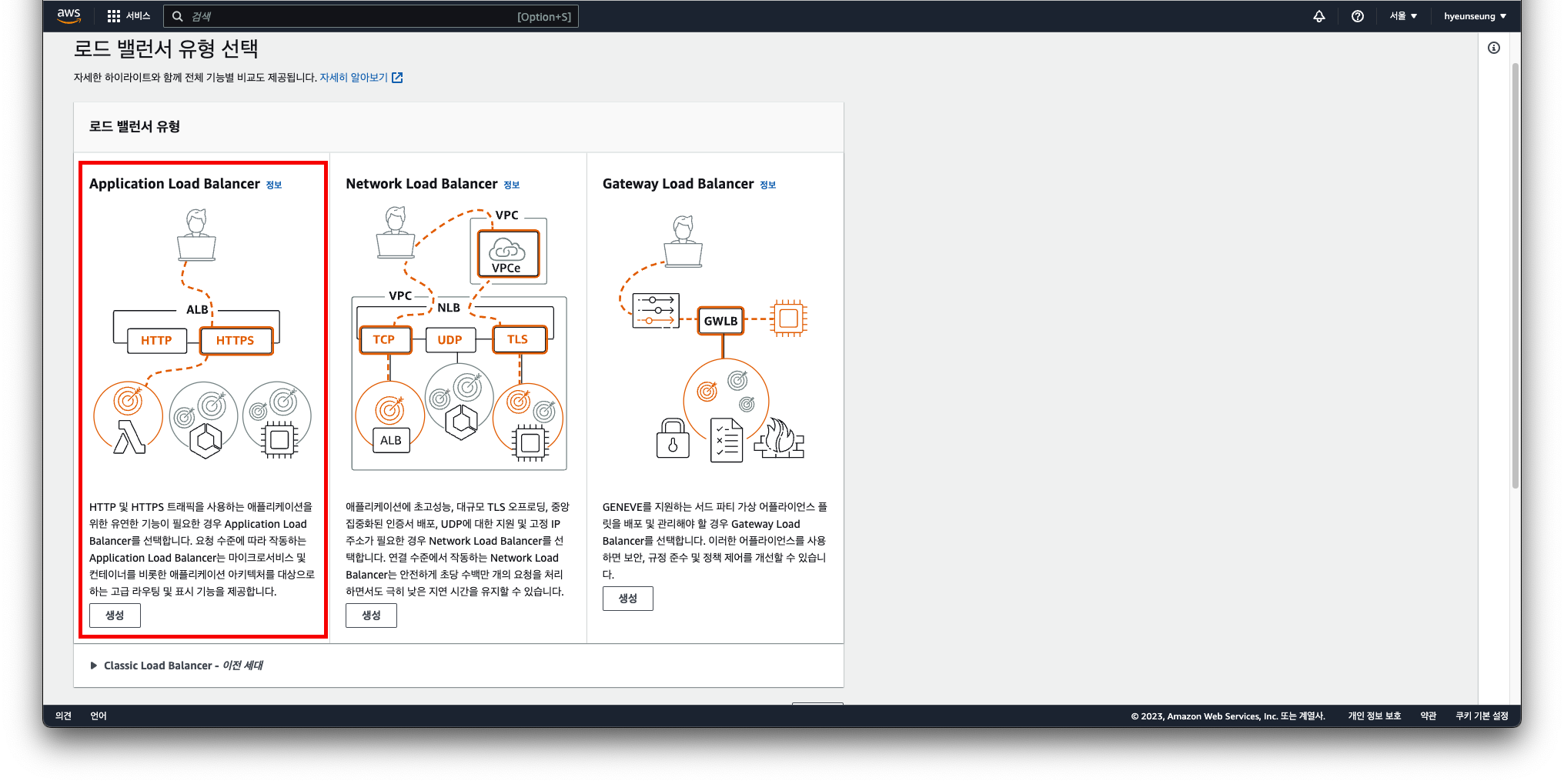 로드밸런서는 application load balancer를 선택합니다. 각 종류마다 차이가 있는데,