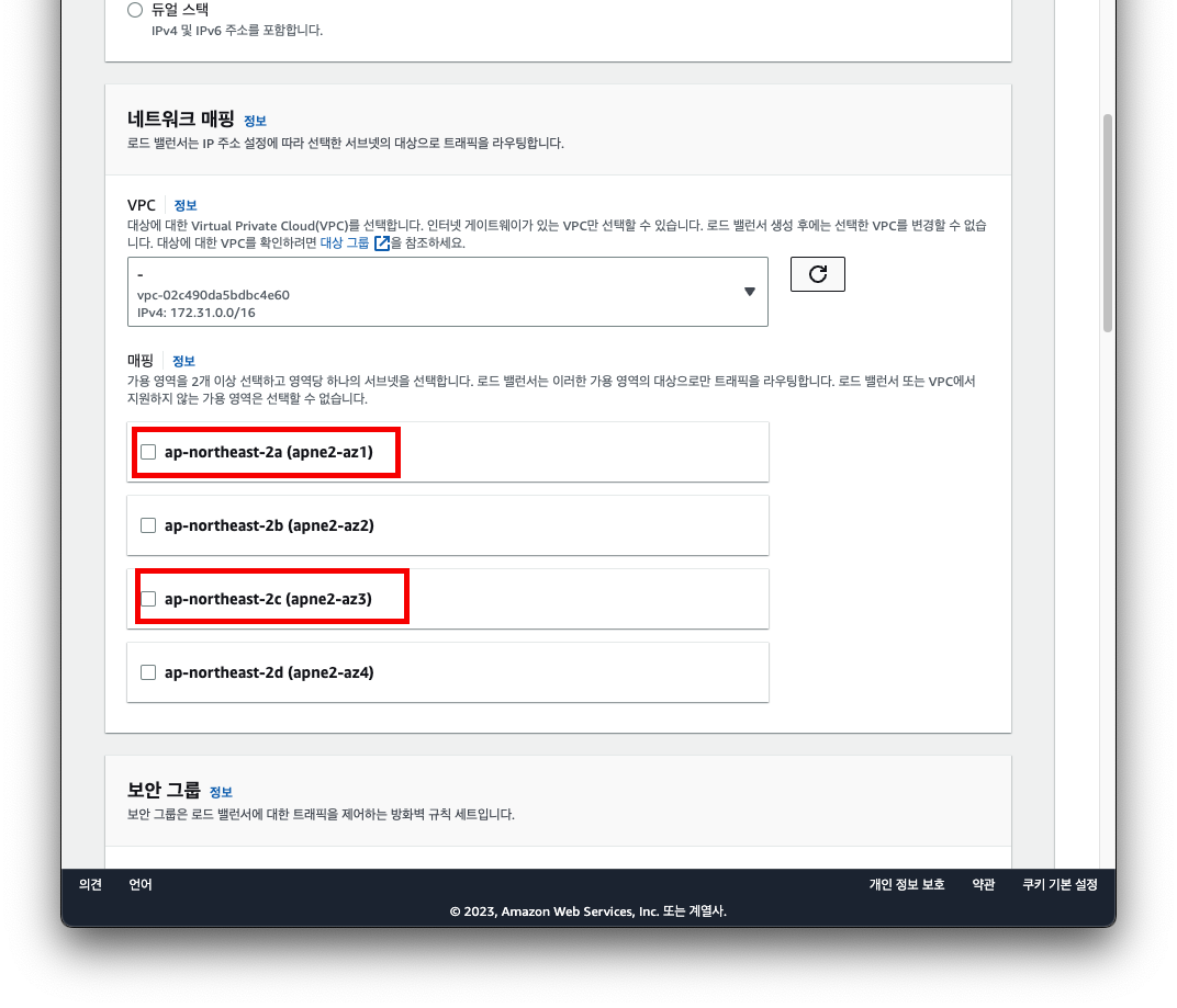네트워크 매핑에서는 아까 설정한 AZ를 선택하고, 생성한 대상 그룹도 지정하여 로드밸런서를 생성합니다.