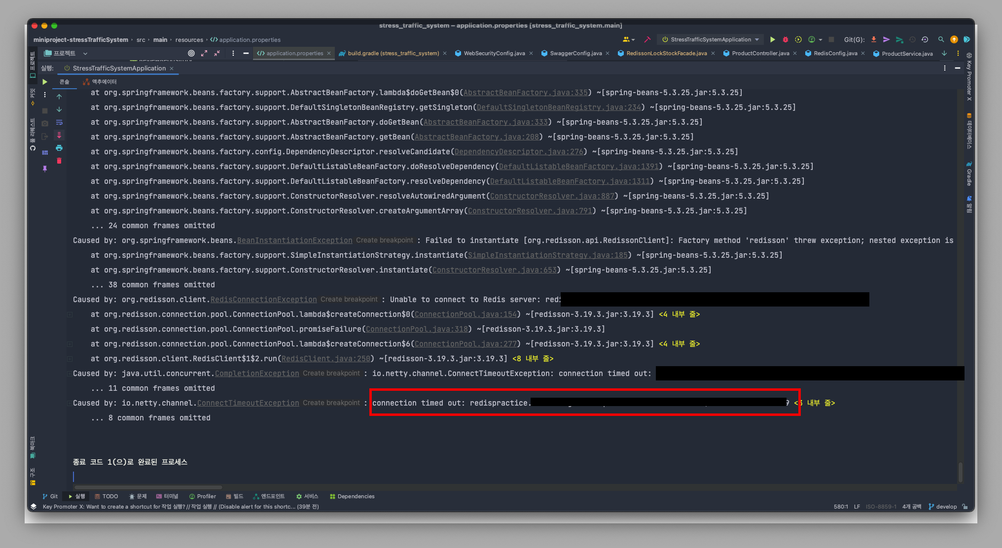미니프로젝트 진행 중, reddison에서 lock 기능을 구현하고 테스트해보려 실행했는데 아래 오류와 함께 실행이 되지 않음
